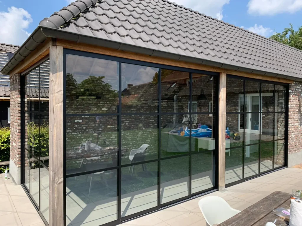 Onze terrasoverkappingen kunnen ook worden voorzien van geïntegreerde zonwering of screens, waardoor je altijd in de schaduw zit, bijvoorbeeld als de zon laag staat. Zo geniet je het hele jaar door van optimaal comfort.
